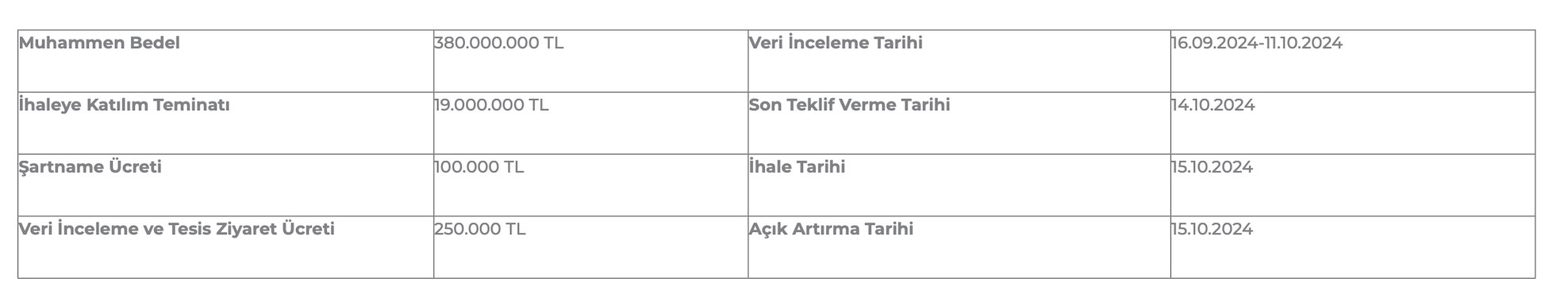 Muhammen bedelinin 380 milyon Türk Lirası, şartname bedelinin 100 bin Türk Lirası, veri inceleme ve tesis ziyaret izni ücretinin 250 bin Türk Lirası şeklinde belirlendiği ihalede, kapalı teklif isteme ve açık artırma usulleri birlikte uygulanacak. İhaleye katılabilmek için 19 milyon Türk Lirası teminat ücreti yatırılması ve 14 Ekim saat 16.30'a kadar teklif verilmesi gerekiyor.