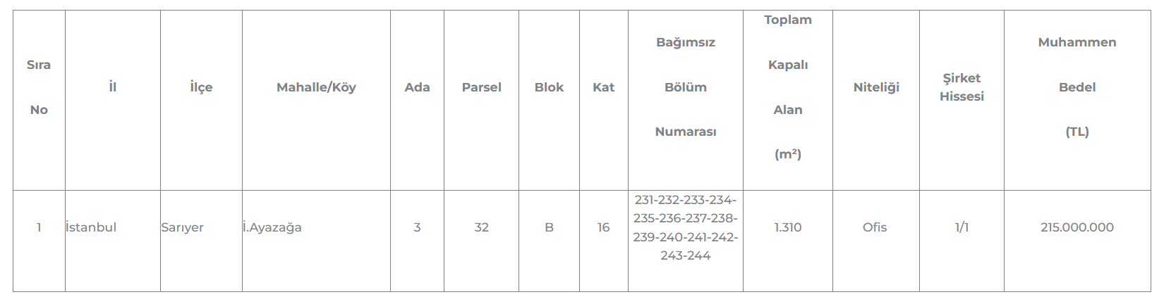 1.310 metrekare alana sahip ofislerin muhammen bedeli 215 milyon TL olarak açıklandı. Gayrimenkullerin satış ihalesi 8 Ağustos 2024 tarihinde gerçekleştirilecek.