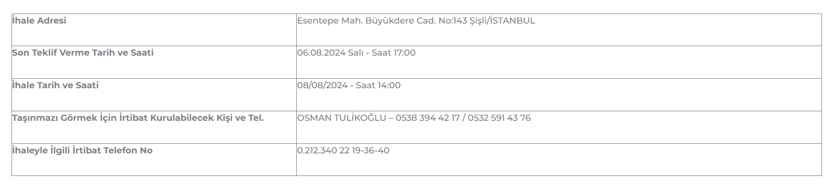Taşınmazların ihalesine katılabilmek için şartnamenin teklif rakamının yazılı olduğu kısmı ile istekliye ait bilgileri içeren kısımlarının doldurularak ve her sayfası imzalanarak eklenecek belgelerle birlikte 06.08.2024 tarihi saat 17:00’a kadar Esentepe Mah. Büyükdere Cad. No:143 Şişli/İSTANBUL adresine teslim edilmesi gerekmektedir.