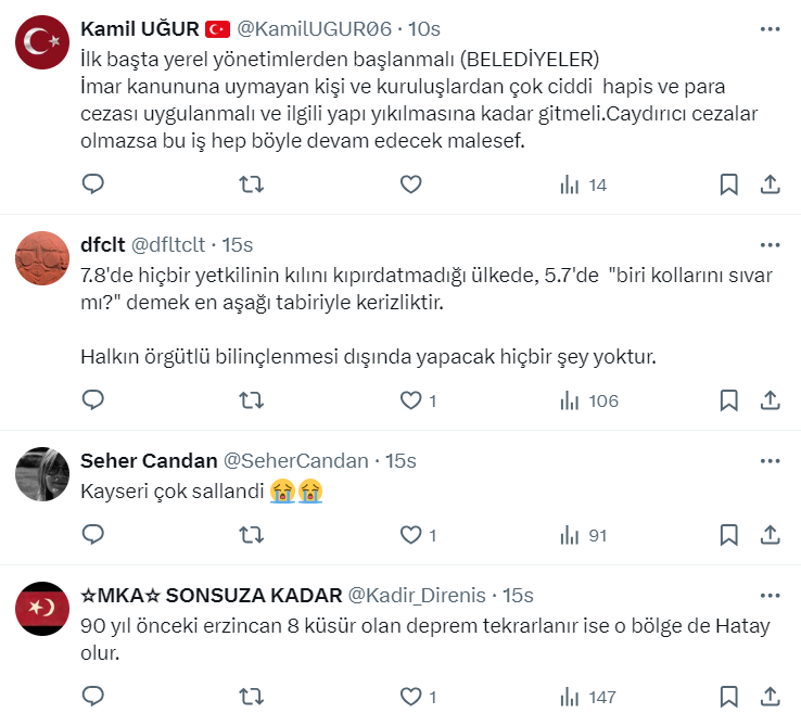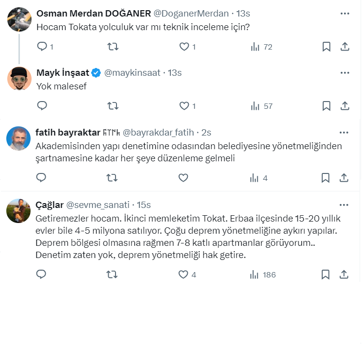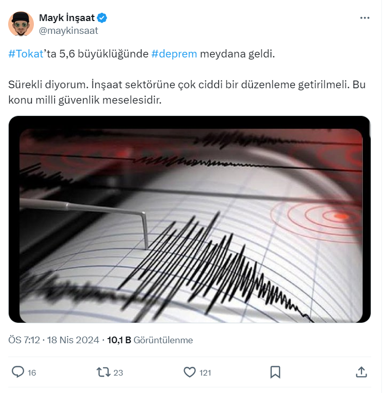 Tokat'ta son 20 saat içinde tam 46 sarsıntı meydana gelirken, Akademisyen İnşaat Mühendisi Mayk İnşaat, X sosyal medya hesabı https://twitter.com/maykinsaat üzerinden yaptığı paylaşımda inşaat sektörüne çok ciddi bir düzenleme getirilmesi gerektiğini söyledi.