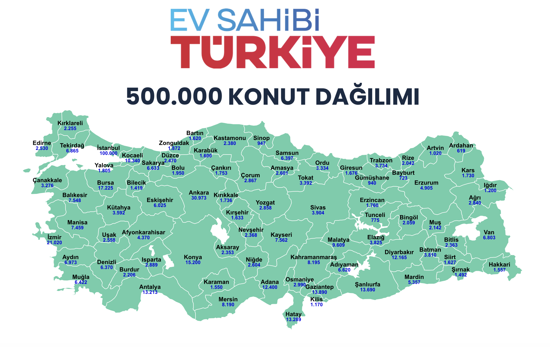 TOKİ tarafından inşa edilecek 500 bin sosyal konut, 81 il geneline yayılırken, projede en fazla payı İstanbul, Ankara, İzmir, Bursa ve Konya alıyor. Konutların 1+1 ve 2+1 tipinde, yatay mimari ve geleneksel mahalle dokusuna uygun olarak tasarlanacağı belirtiliyor.