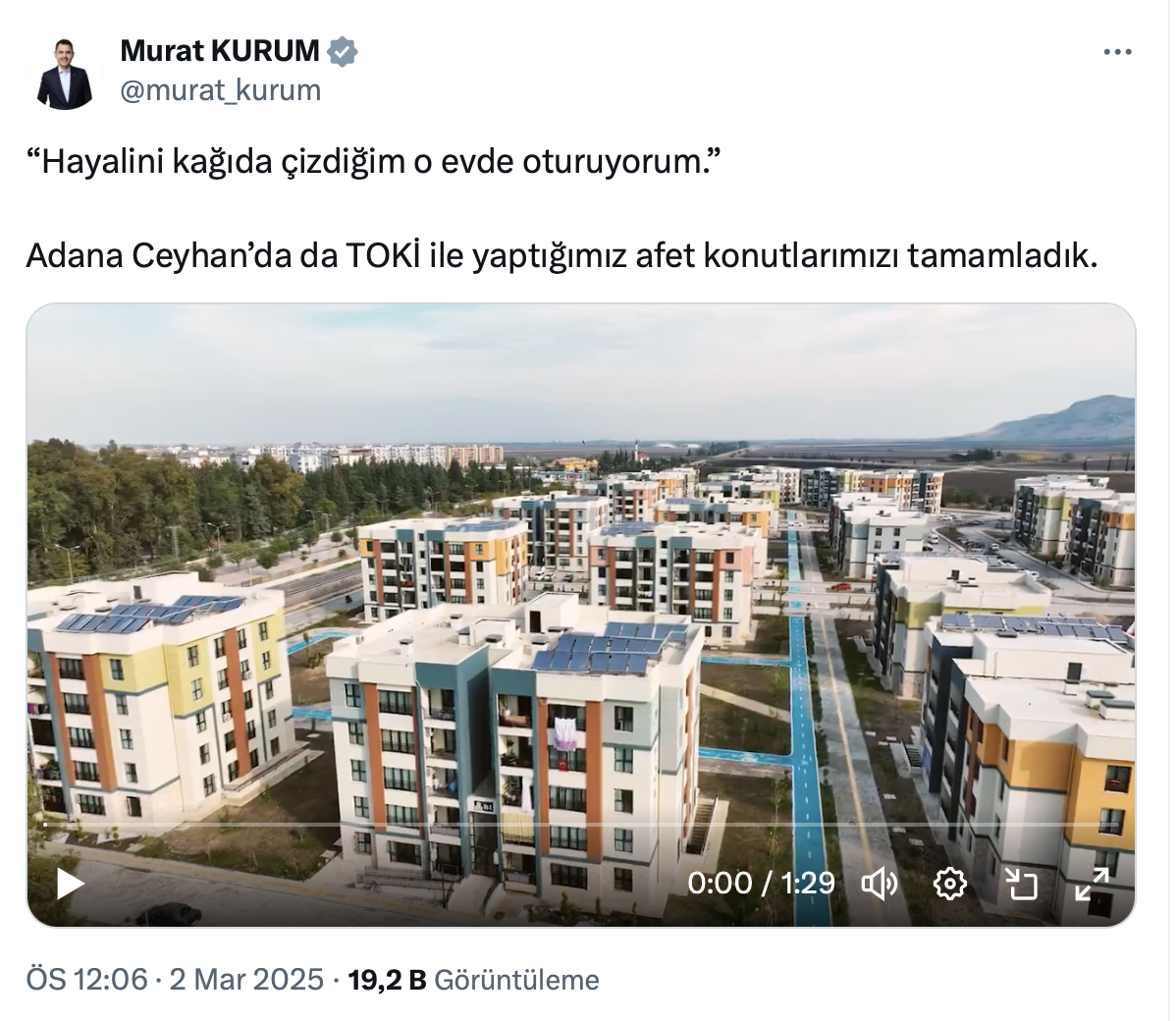 Paylaşımında, hak sahibi Ceylan Gök'ün "Hayalini kağıda çizdiğim o evde oturuyorum" sözlerini alıntılayan Bakan Murat Kurum, "Adana Ceyhan'da da TOKİ ile yaptığımız afet konutlarımızı tamamladık." dedi.