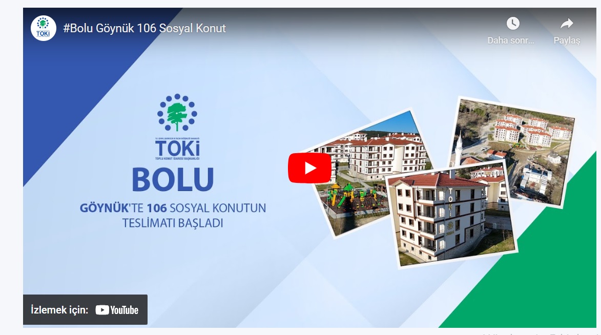 Çevre, Şehircilik ve İklim Değişikliği Bakanlığı Toplu Konut İdaresi Başkanlığı (TOKİ) tarafından Bolu Göynük Çeşme Mahallesi'nde yapımına başlanan 106 sosyal konut tamamlandığı kaydedildi.