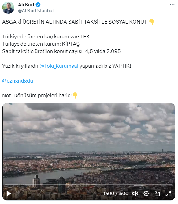 TOKİ ve KİPTAŞ arasındaki konut tartışmaları devam ederken KİPTAŞ Genel Müdürü Ali Kurt resmi sosyal medya hesabından yine çok konuşulacak bir açıklama yaptı.
