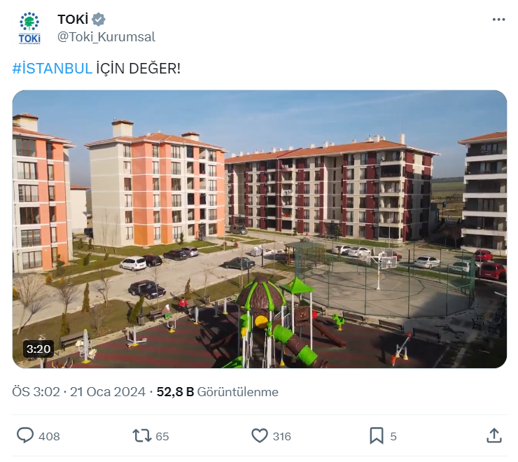 Türkiye'nin dört bir yanında yeni konut projeleri inşa eden Çevre, Şehircilik ve İklim Değişikliği Bakanlığı Toplu Konut İdaresi Başkanlığı (TOKİ) tarafından İstanbul’da devam eden projelere ilişkin olarak resmi sosyal medya hesabı https://twitter.com/Toki_Kurumsal üzerinden bir video yayınlandı.