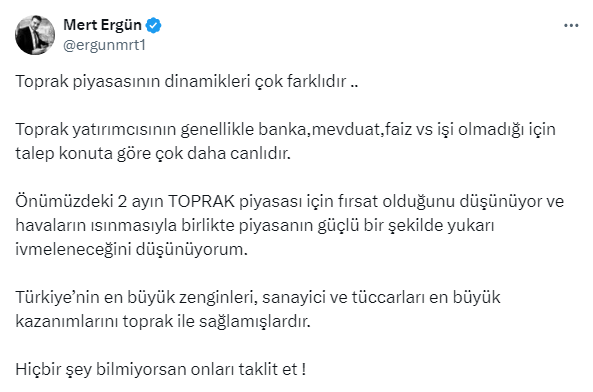 Toprak yatırımı için fırsat dönemi olduğunu söyleyen girişimci Mert Ergün bunun nedenlerini açıkladı. Ergün https://twitter.com/ergunmrt1 X sosyal medya hesabından yaptı iki paylaşımda toprak piyasasının dinamiklerini anlatarak, daha önce yapılan yatırımların getirilerini örnek verdi.