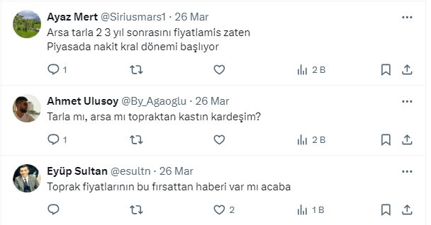 Toprak yatırımcısının genellikle banka, mevduat, faiz vs işi olmadığı için talep konuta göre çok daha canlıdır.