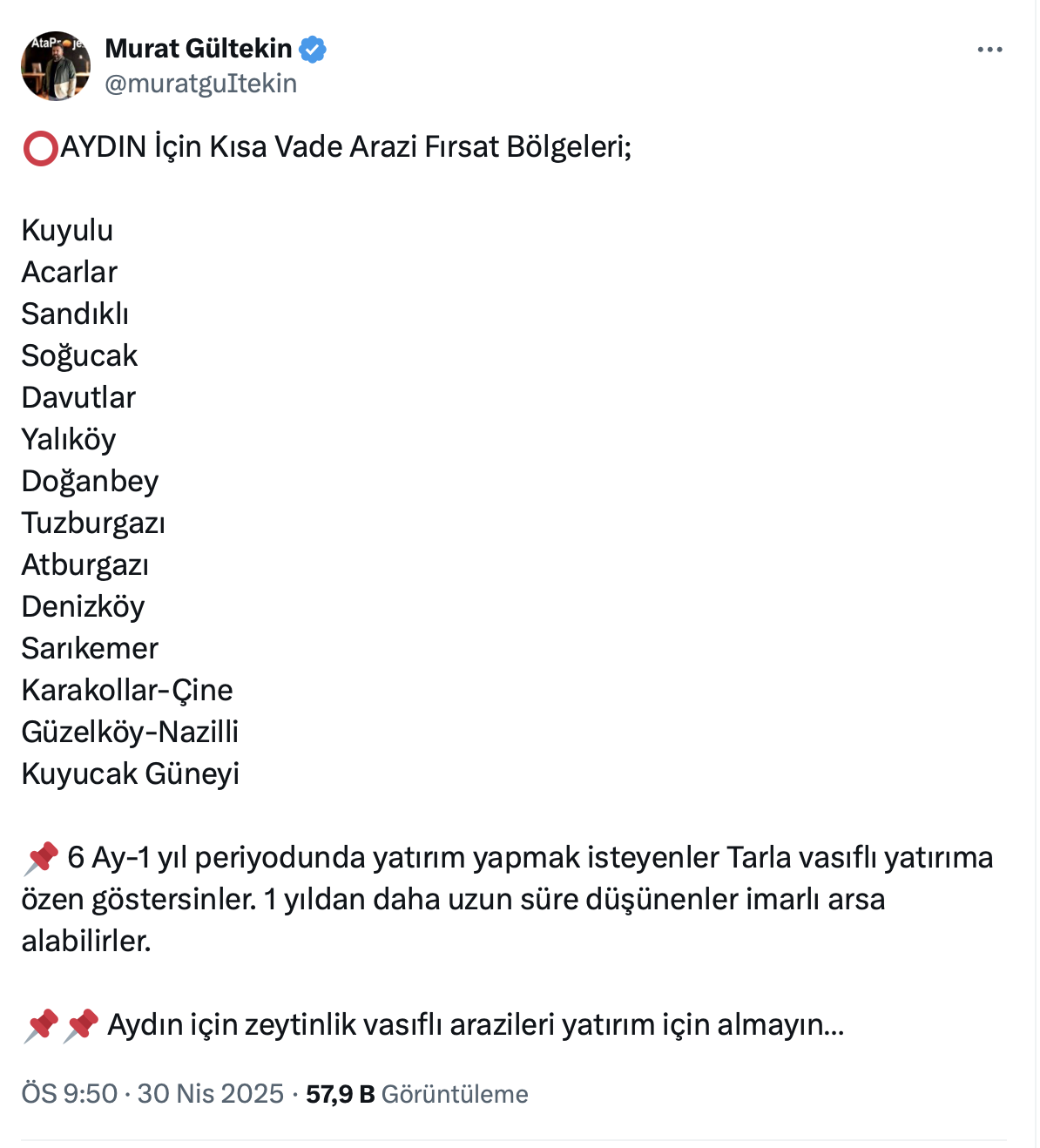 Gayrimenkul Uzmanı Murat Gültekin, resmi sosyal medya hesabı https://x.com/muratguItekin yaptığı paylaşımda Aydın için kısa vade arazi fırsat bölgelerini açıkladı.