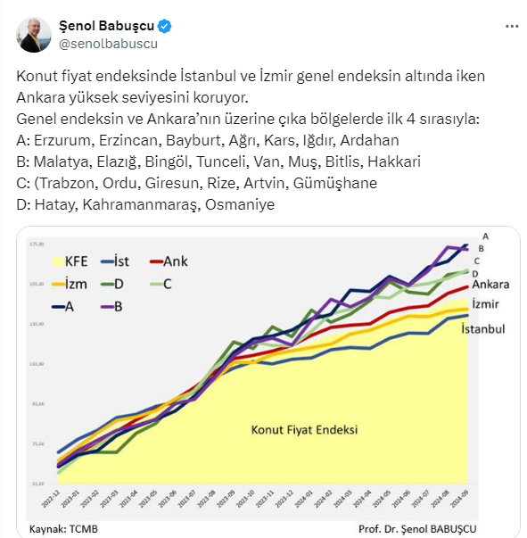 Ziraat Bankası eski Genel Müdür Yardımcısı ve Başkent Üniversitesi Uluslararası Finans ve Bankacılık Bölüm Başkanı Prof. Dr. Şenol Babuşcu, açıklanan rakamları değerlendirdi. Babuşcu, paylaştığı grafikle birlikte Doğu Karadeniz ve Doğu Anadolu’daki şehirlerde konut fiyatlarındaki artışa dikkat çekti. Babuşcu https://x.com/senolbabuscu X sosyal medya hesabı üzerinden yaptığı paylaşımda şunları söyledi: