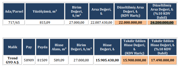 Trend GYO'nun 717 ada 65 parselde yer alan arsasının KDV hariç piyasa değeri 22 milyon TL, KDV dahil değeri ise 24 milyon 200 bin TL olarak belirlendi.
