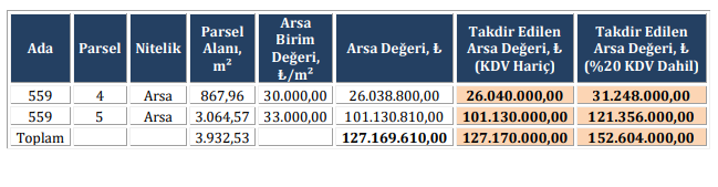 559 ada 5 parsel arsa; Takdir edilen arsa değeri KDV hariç 101 milyon 130 bin TL, yüzde 20 KDV dahip bedeli 121 milyon 356 bin TL olarak belirlendi.