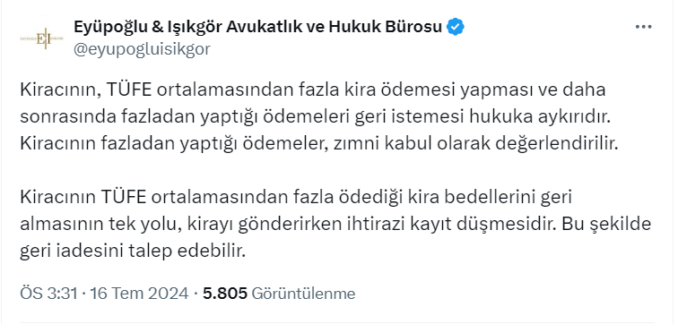 Eyüpoğlu - Işıkgör Avukatlık ve Hukuk Bürosu resmi sosyal medya hesabı https://x.com/eyupogluisikgor üzerinden yaptığı paylaşımda kiracının, TÜFE ortalamasından fazla kira ödemesi yapmasının ve daha sonrasında fazladan yaptığı ödemeleri geri istemesi hukuka aykırı olduğunu belirtti.