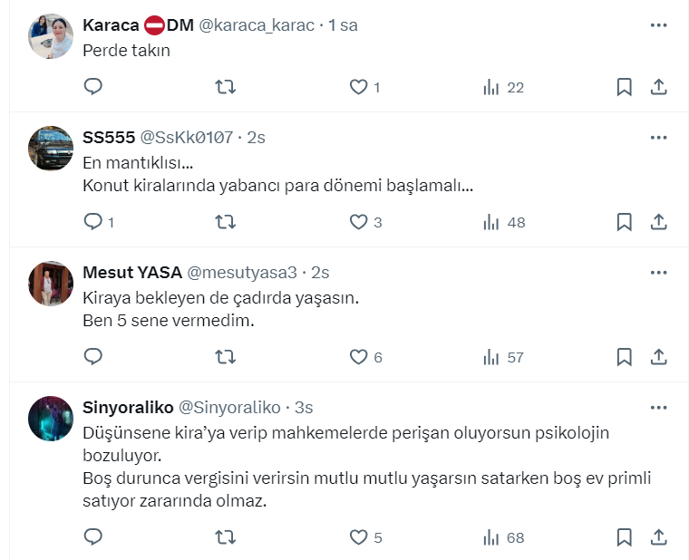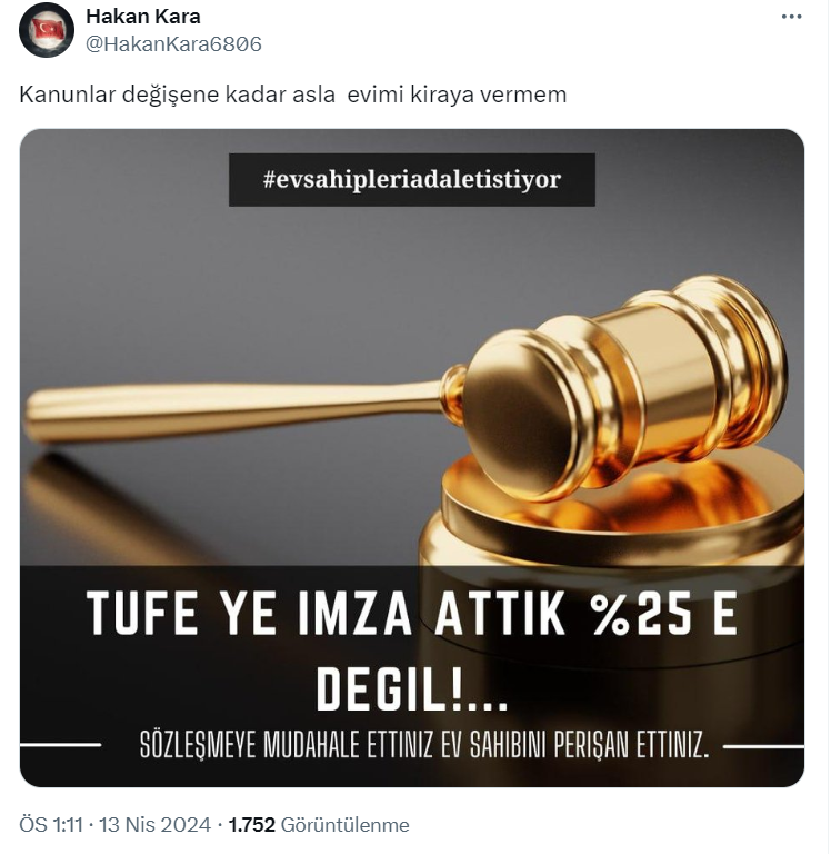 Son olarak TÜFE'ye imza attık yüzde 25'e değil diyen mağdur ev sahibi https://twitter.com/HakanKara6806 X sosyal medya hesabı üzerinden yaptığı paylaşımda kanunlar değişene kadar evini asla kiraya vermeyeceğini söyledi.