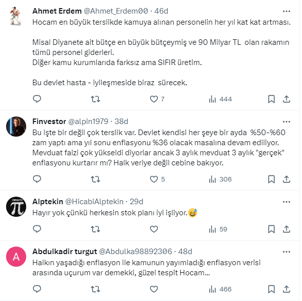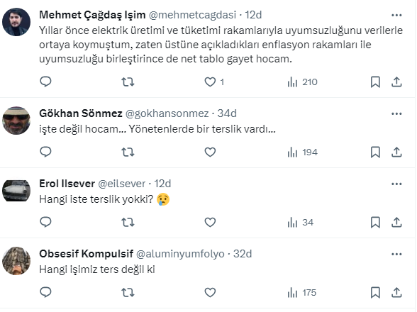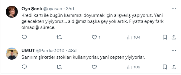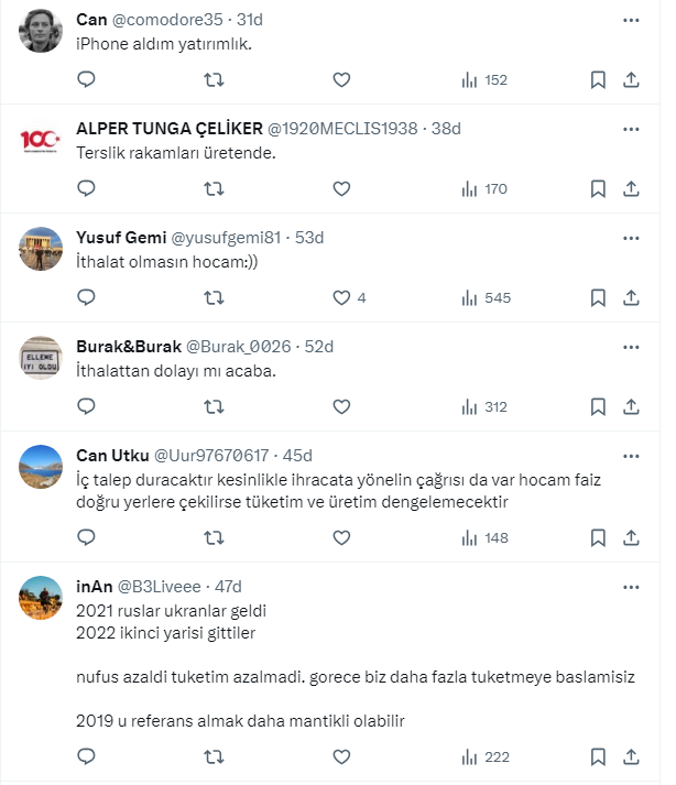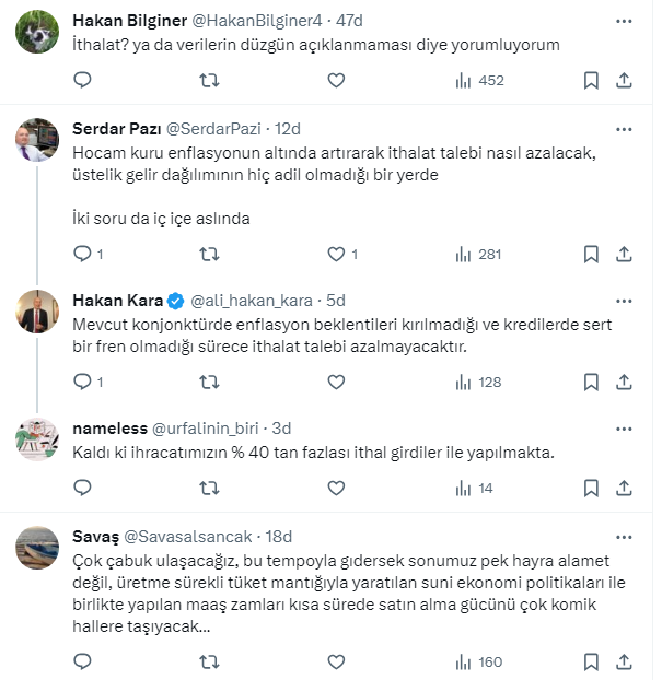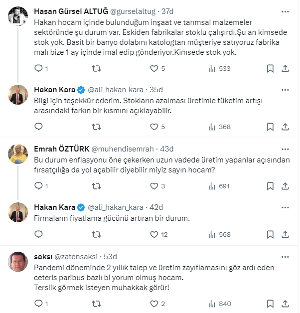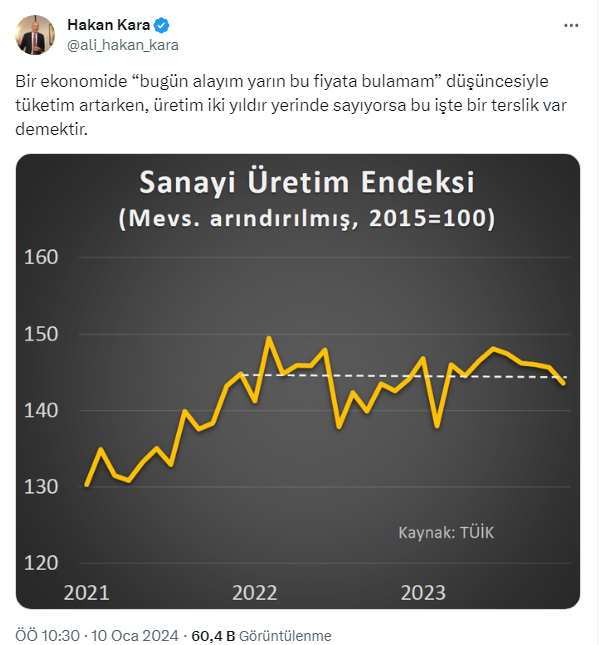İktisatçı akademisyen, Bilkent Üniversitesi Öğretim Üyesi, TCMB eski Başekonomisti Hakan Kara resmi sosyal medya hesabı https://twitter.com/ali_hakan_kara üzerinden yaptığı paylaşımda "Bir ekonomide “bugün alayım yarın bu fiyata bulamam” düşüncesiyle tüketim artarken, üretim iki yıldır yerinde sayıyorsa bu işte bir terslik var demektir." ifadelerini kullandı.