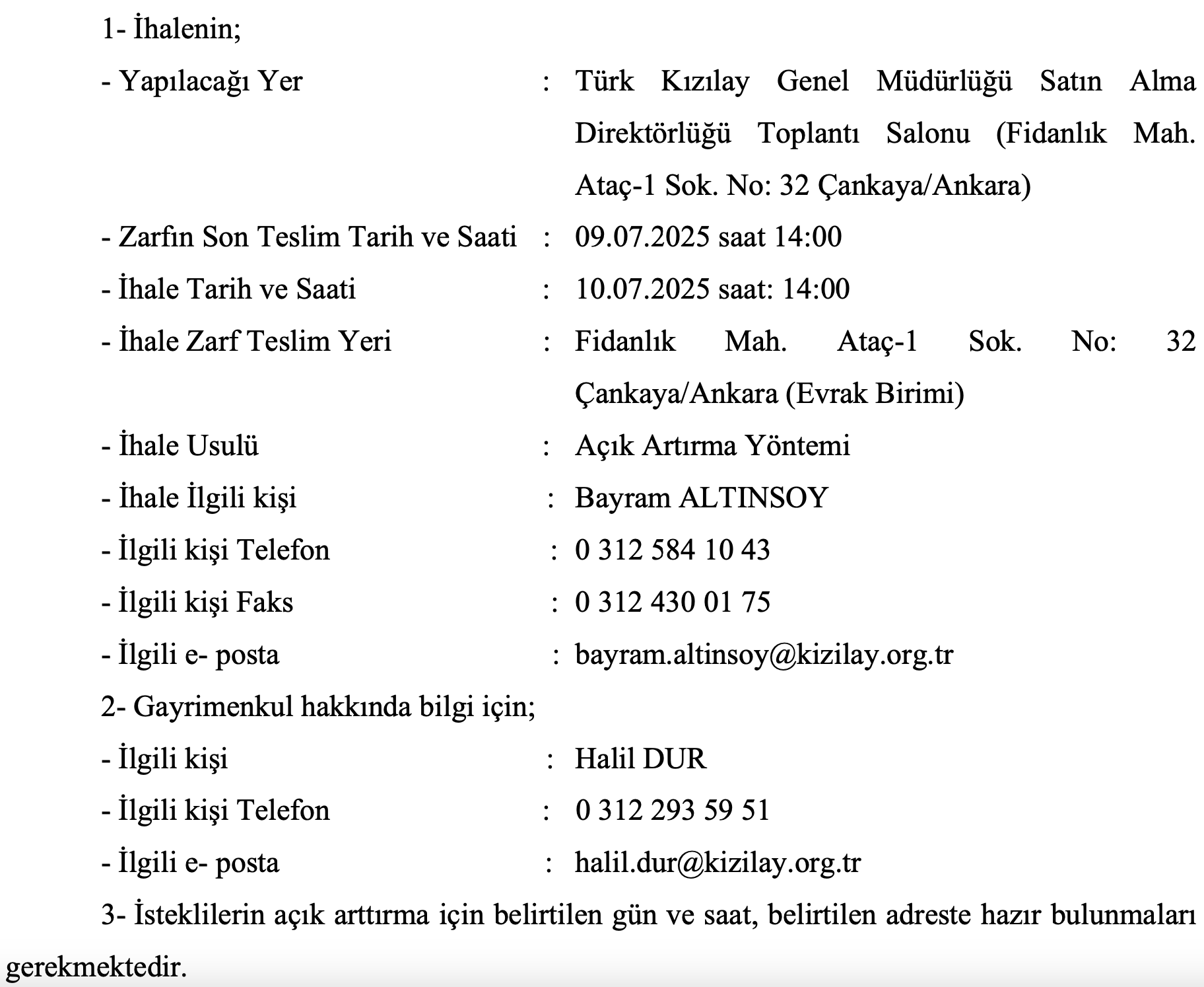 Muhammen bedelleri 125 milyon TL olarak açıklanan gayrimenkullerin satış ihalesi 10 Temmuz 2025 tarihinde saat 14.00’te Türk Kızılay Genel Müdürlüğü Satın Alma Direktörlüğü Toplantı Salonu’nda yapılacak.