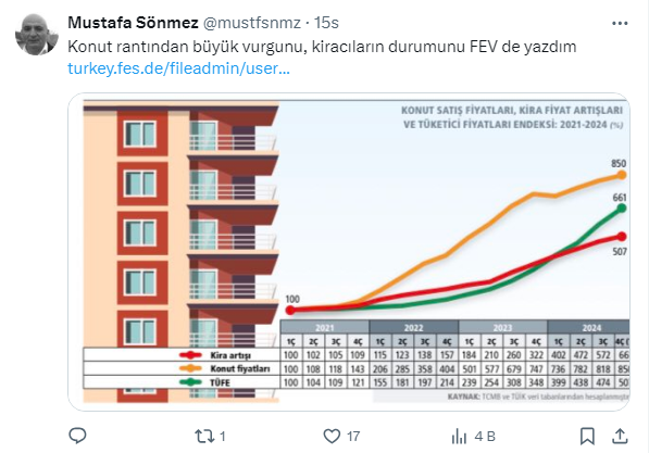 İktisatçı Mustafa Sönmez, son üç yılda yaşanan ağır enflasyon karşısında konuta yatırımın bir korunma yolu haline geldiği şartlarda konut fiyatlarındaki artışın enflasyonu büyük ara geçtiğini ve kiralara da olumsuz biçimde yansıdığını söyledi.