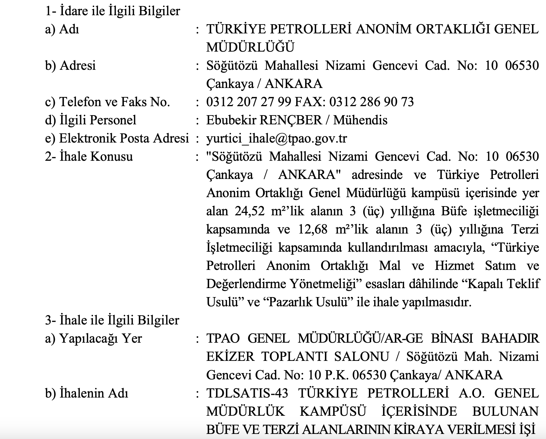Türkiye Petrolleri, Türkiye Petrolleri A.O. Genel Müdürlük Kampüsü içerisinde bulunan büfe ve terzi alanlarını kiraya verecek.
