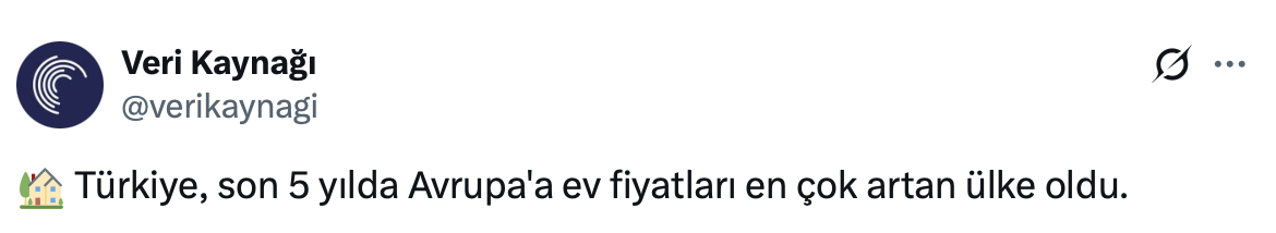 Konut fiyatları son günlerin en çok konuşulan konuları arasında yer alırken, 95 bin takipçili Veri Kaynağı’nın sosyal medya hesabı https://x.com/verikaynagi üzerinden yapılan paylaşımda Türkiye’nin son 5 yılda Avrupa’da ev fiyatlarının en çok arttığı ülke olduğu belirtildi.