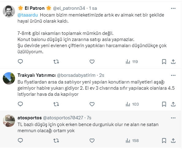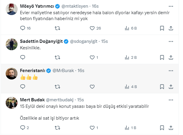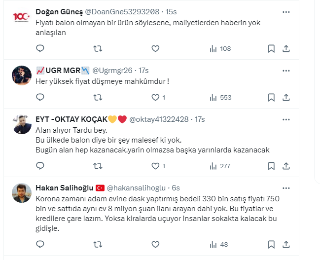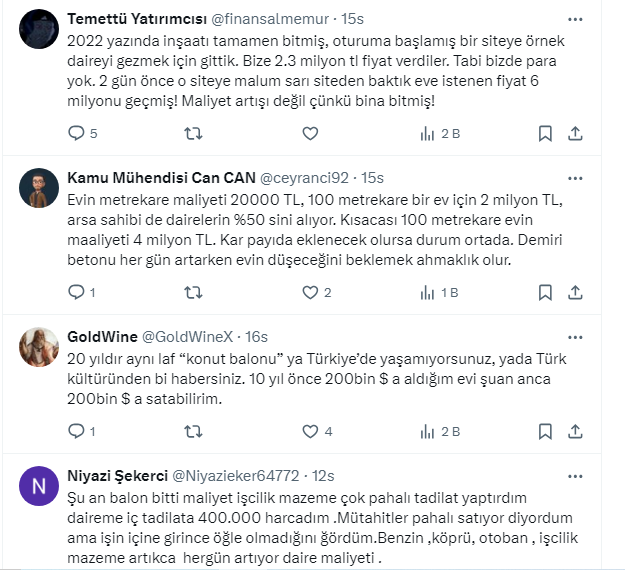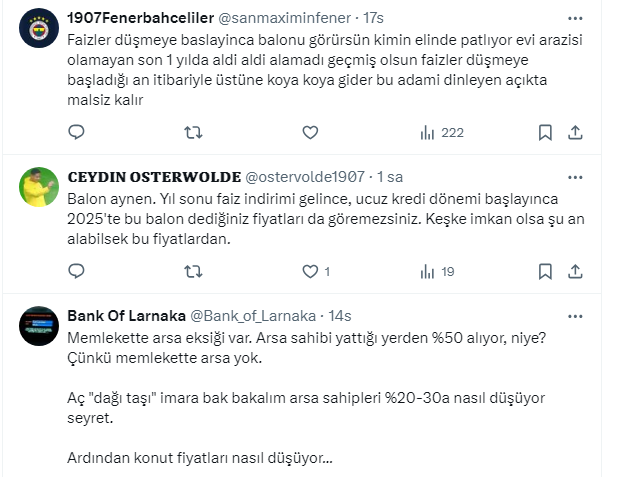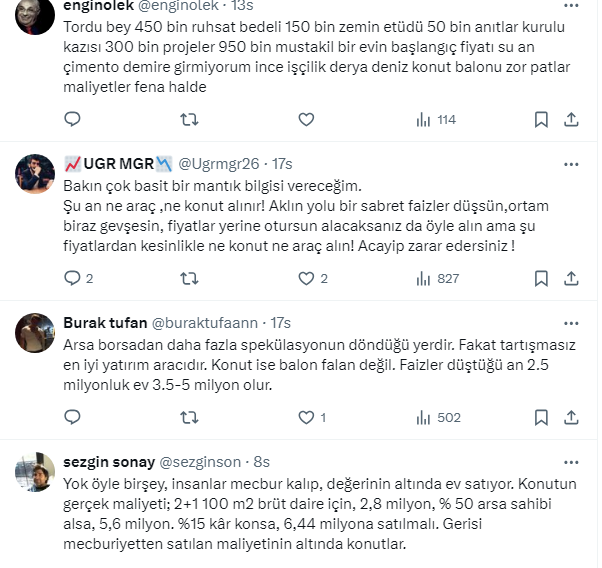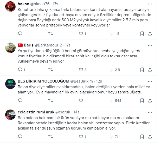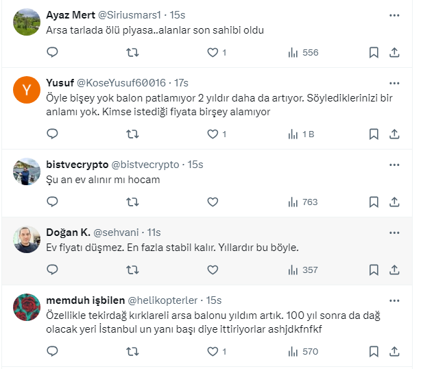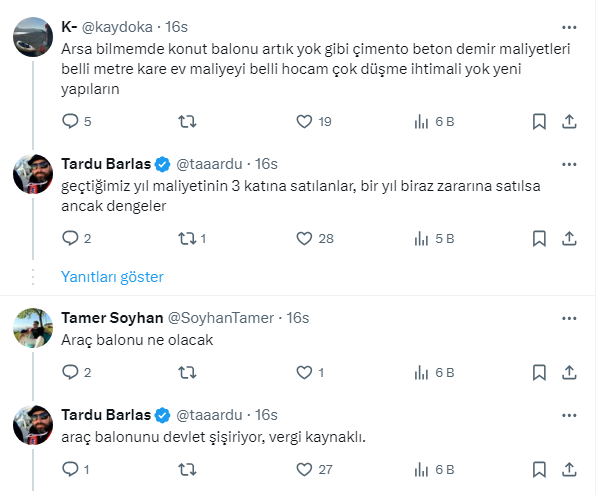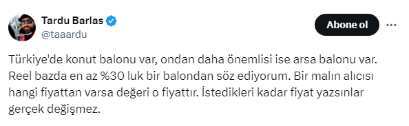 Borsa Temel Analisti Tardu Barlas, https://x.com/taaardu X sosyal medya hesabından yaptığı paylaşımda, Türkiye’de hem konut hem de arsa fiyatlarında balon olduğunu söyledi. Barlas arsa fiyatlarındaki balonun yüzde 30 olduğu belirttiği paylaşımında şunları aktardı: