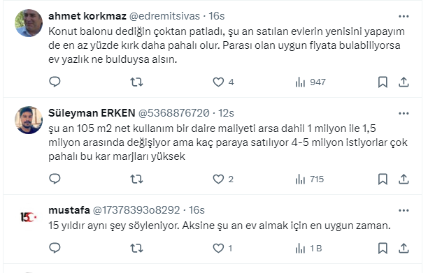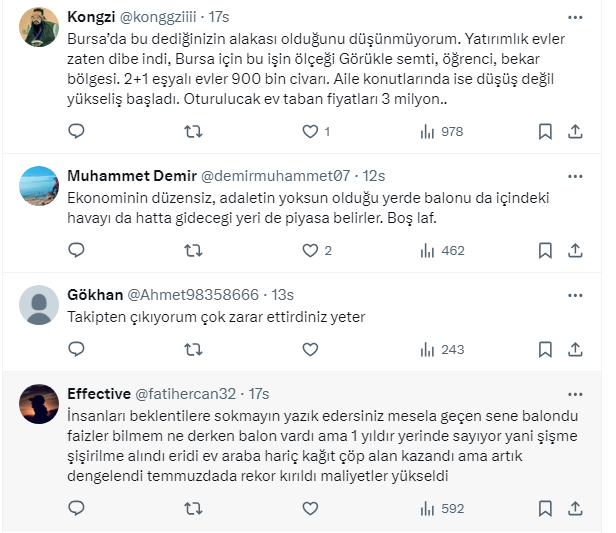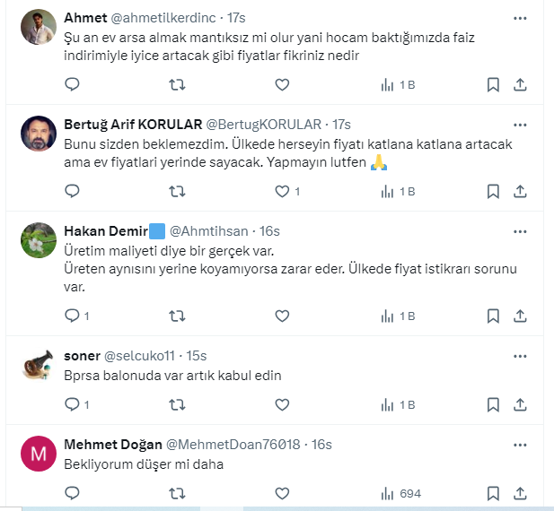 “Türkiye'de konut balonu var, ondan daha önemlisi ise arsa balonu var. Reel bazda en az yüzde 30 luk bir balondan söz ediyorum. Bir malın alıcısı hangi fiyattan varsa değeri o fiyattır. İstedikleri kadar fiyat yazsınlar gerçek değişmez.”