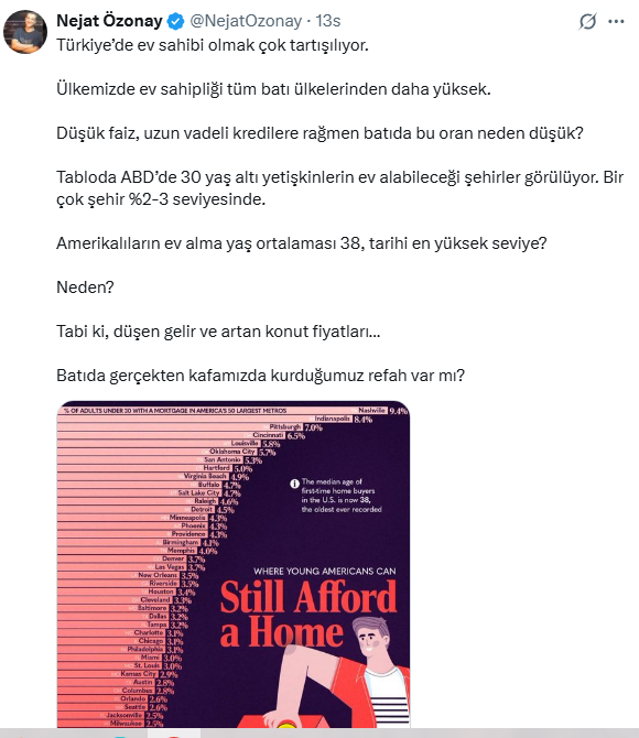 Amerikalıların ev alma yaş ortalamasının 38 ile tarihi en yüksek seviye olduğunu belirten Özonay, takipçilerine'Batıda gerçekten kafamızda kurduğumuz refah var mı?' sorusunu sordu.