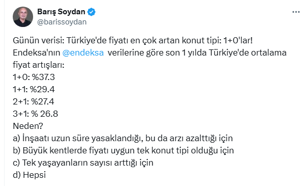 En çok fiyat artışının 1+0'larda görüldüğünü aktaran Soydan bunun nedenini takipçilerine sordu. İşte Barış Soydan'ın sosyal medya hesabı X'ten yaptığı o paylaşım ve takipçilerden gelen yorumlar...