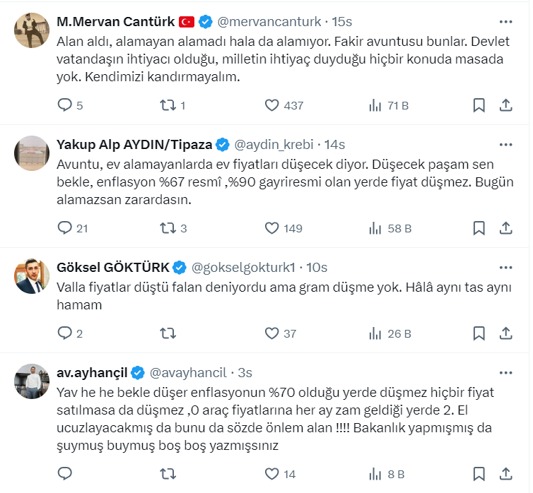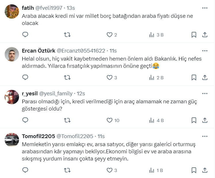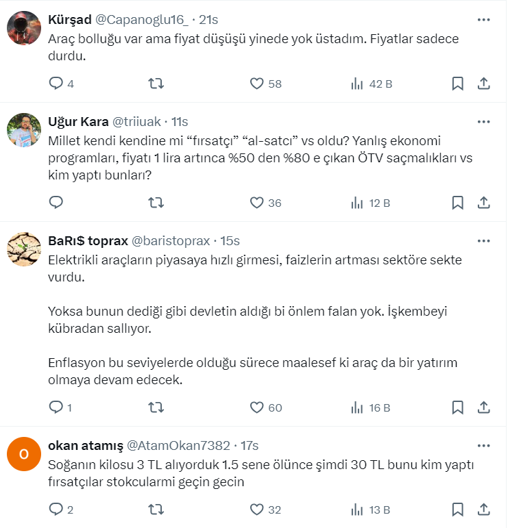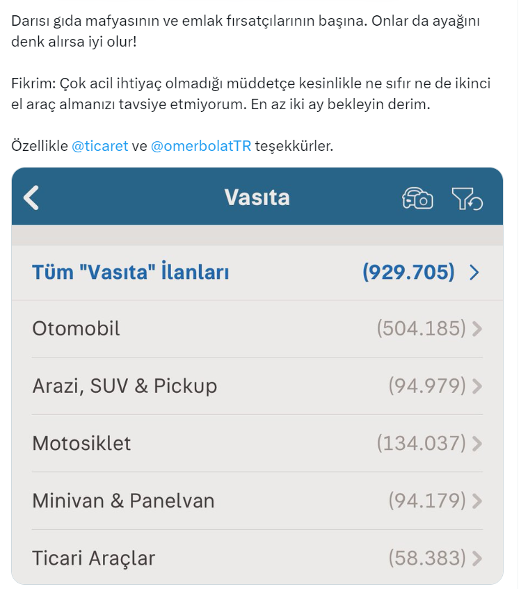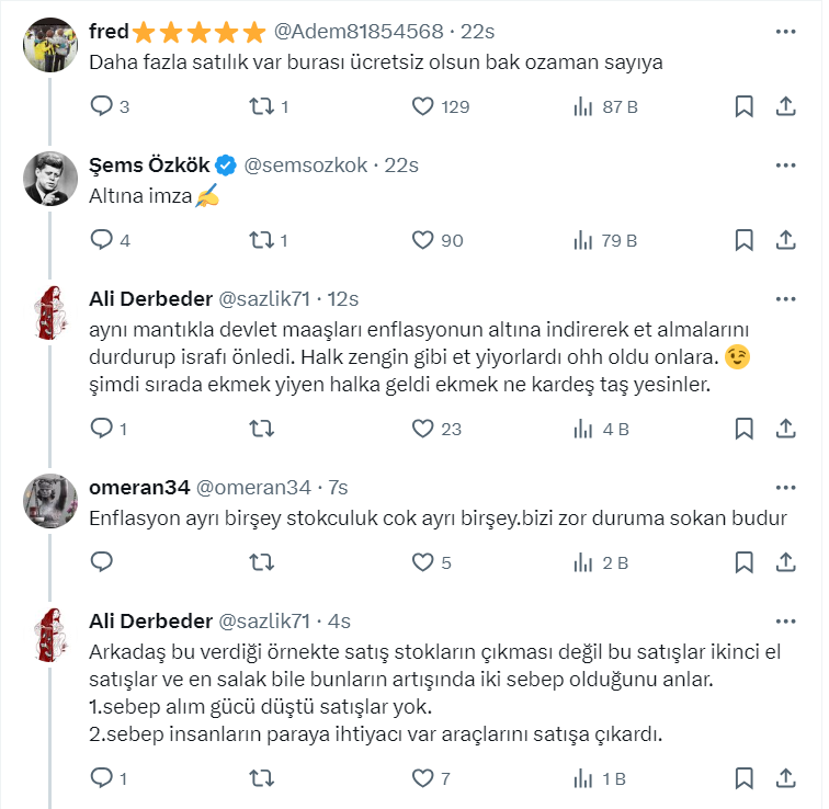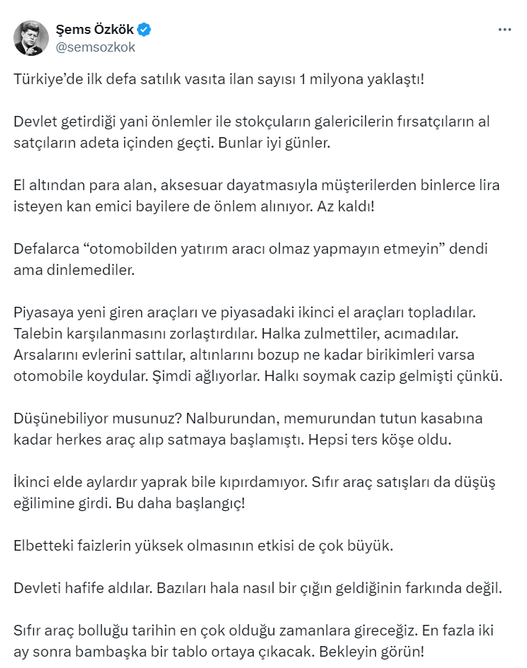 Şems Özkök X hesabı https://twitter.com/semsozkok üzerinden yaptığı paylaşımda devletin getirdiği yani önlemler ile stokçuların galericilerin fırsatçıların al satçıların adeta içinden geçtiğini belirtti.