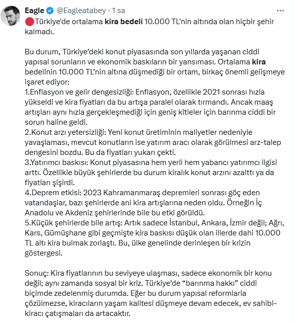 Eagle isimli sosyal medya kullanıcısı konuyla ilgili yaptığı paylaşımda ortalama kira bedelinin 10.000 TL’nin altına düşmediği bir ortam, birkaç önemli gelişmeye işaret ettiğini açıkladı. İşte o nedenler;