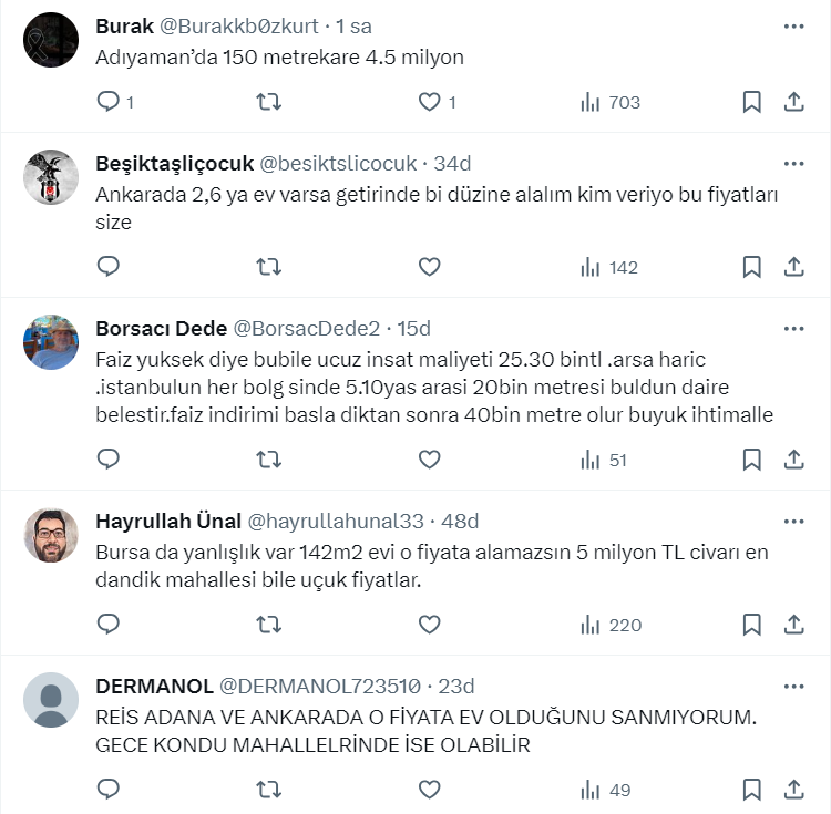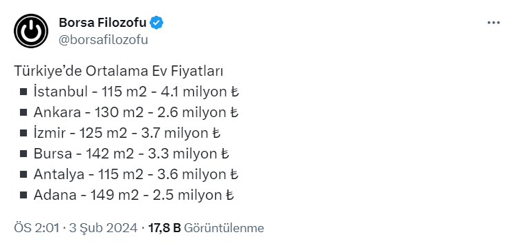 Yaptığı paylaşımlarla dikkat çeken 223,8 bin takipçili Borsa Filozofu resmi X hesabı https://twitter.com/borsafilozofu üzerinden Türkiye’de ortalama ev fiyatlarını paylaştı. Peki Türkiye'de ortalama konut fiyatları ne kadar?