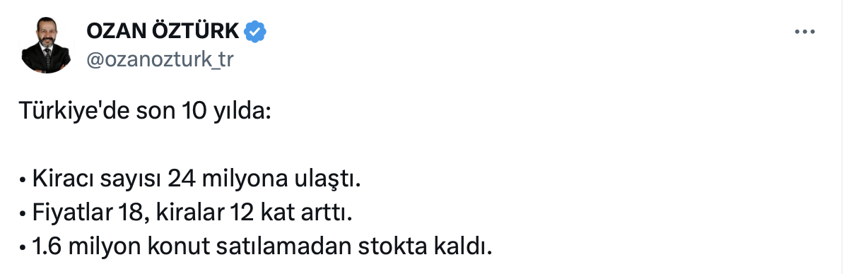 Ozan Öztürk paylaşımında “Fiyatlar 18, kiralar 12 kat arttı, 1.6 milyon konut satılamadan stokta kaldı” ifadelerini kullandı.