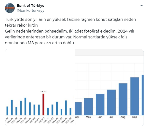 Konut satış rakamlarının yüksek faiz oranlarına rağmen bu kadar artması merak ediliyor. Peki konut satış rakamları neden yükseldi? Bank Of Türkiye sosyal medya hesabı X'ten bunun 2 nedenini açıkladı.