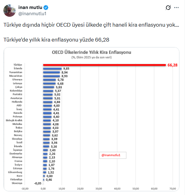 Kira bedelleri vatandaşın belini büküyor. Fahiş rakamlar karşısında ezilen vatandaş, barınma krizi ile karşı karşıya kaldı. Ülke genelinde yükselen kiralar gündemin en büyük sorunları arasında geliyor. Analist İnan Mutlu da sosyal medya hesabı X'ten kiralardaki yükselişi değerlendirerek ''Türkiye dışında hiçbir OECD üyesi ülkede çift haneli kira enflasyonu yok...'' açıklamasında bulundu.