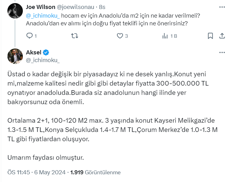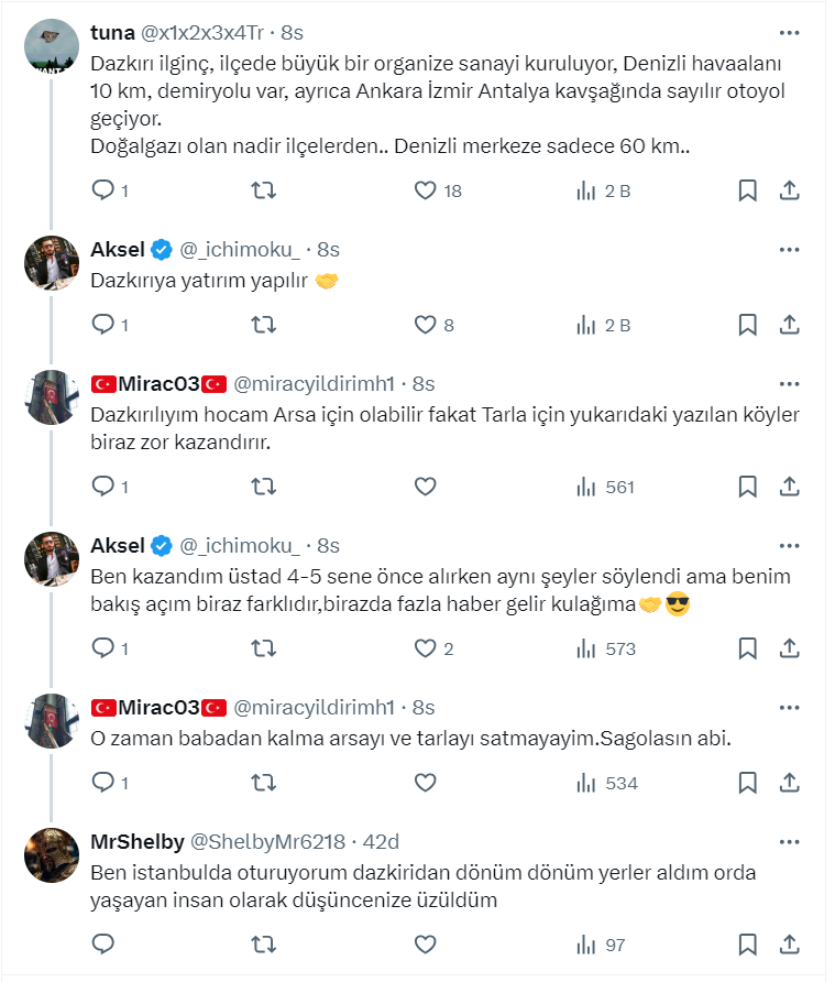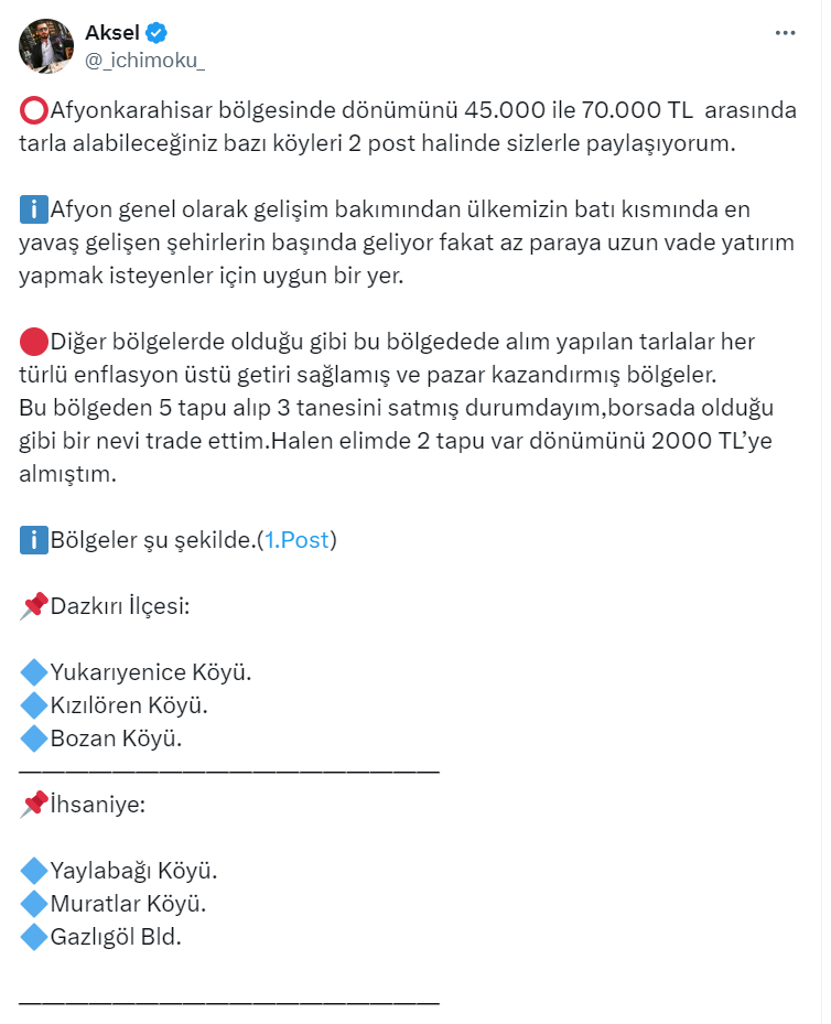Toprak yatırımcısı ve danışmanı 40,4 bin takipçili Aksel isimli kullanıcı, https://twitter.com/_ichimoku_ X sosyal medya hesabından arsa ve arazi yatırımı ile ilgili çok önemli bir paylaşım yaptı. Aksel paylaşımında Afyonkarahisar bölgesinde dönümü 45 bin ile 70 bin TL arasında tarla alınabilecek bazı köyleri paylaştı.