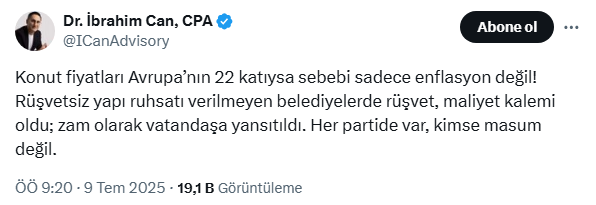 Finansal Yönetim Başkanı Dr. İbrahim Can, sosyal medya hesabından Türkiye'deki konut fiyatlarının neden bu kadar yüksek olduğunu açıkladı. Türkiye'deki konut fiyatlarının Avrupa'nın 22 katına çıktığını söyleyen Can, ''sebebi sadece enflasyon değil! Rüşvetsiz yapı ruhsatı verilmeyen belediyelerde rüşvet, maliyet kalemi oldu.'' dedi.