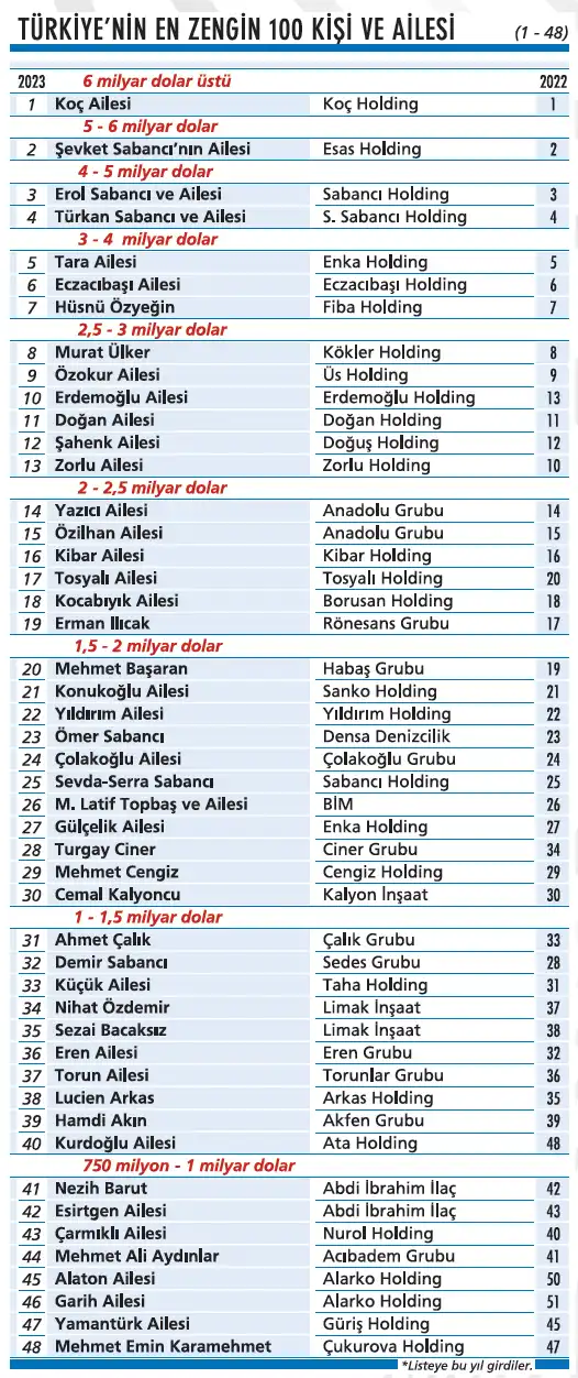 Listenin ilk sıralarında Koç Ailesi, bu yaz ailesiyle beraber geçirdiği tekne kazasıyla gündeme gelen Ali Sabancı ve kardeşlerinin oluşturduğu Şevket Sabancı'nın ailesi ile Erol Sabancı Ailesi, ilk sıralarda yer aldılar.