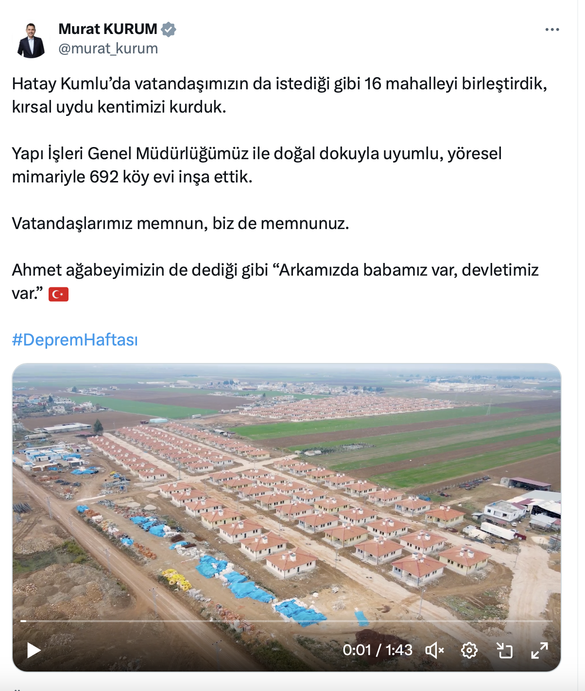 Paylaşılan detaylara göre Bakan Kurum, Hatay'ın Kumlu ilçesine bağlı Cumhuriyet Mahallesi'nde hayata geçirilen "kırsal uydu kentine" ilişkin sosyal medya hesabı https://x.com/murat_kurum üzerinden videolu paylaşım yaptı.