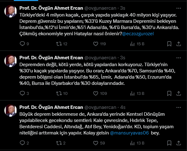 Prof Dr. Ahmet Ercan sosyal medya hesabından ülke genelindeki kaçak yapılaşmayı ele aldı. İllere göre dağılım yapan Ahmet Ercan 'depremden değil, kaçak yapılardan korkuyoruz' dedi. Övgün Ercan, bu yapıların tehlike saçtığına vurgu yaparak il il açıkladı. Sosyal medya hesabından yaptığı bu açıklama kaçak yapılaşmayı bir kez daha gün yüüzne çıkardı. İşte Övgün Ercan'ın o açıklamaları ve gelen yorumlar...