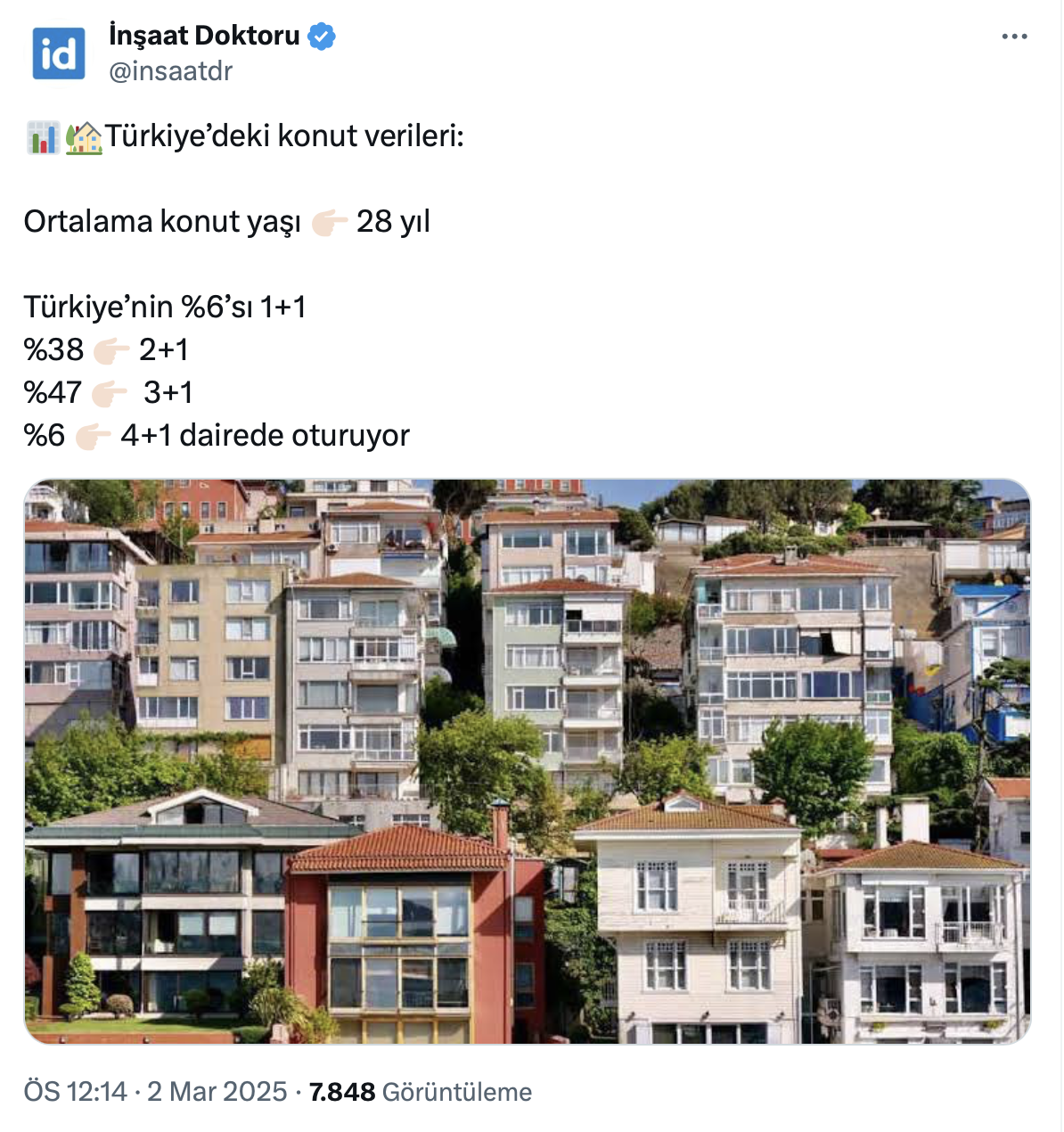 28,5 bin takipçili İnşaat Doktoru resmi X hesabı https://twitter.com/insaatdr üzerinden Gayrimenkul Değerleme Uzmanı Dr. Ahmet Büyükduman’ın açıkladığı Türkiye’deki konut verilerini paylaştı.