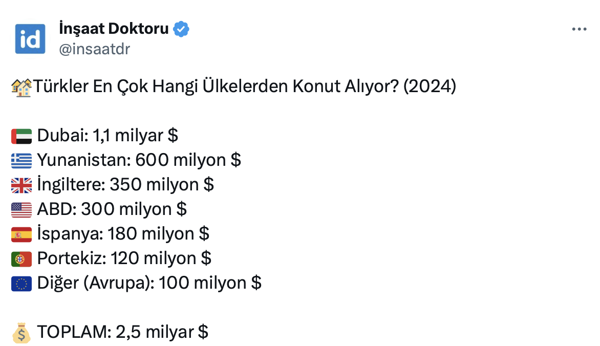 59,6 bin takipçili İnşaat Doktoru resmi sosyal medya hesabı üzerinden yaptığı paylaşıma göre Türkler en çok Dubai, Yunanistan ve İngiltere’den konut alıyor.