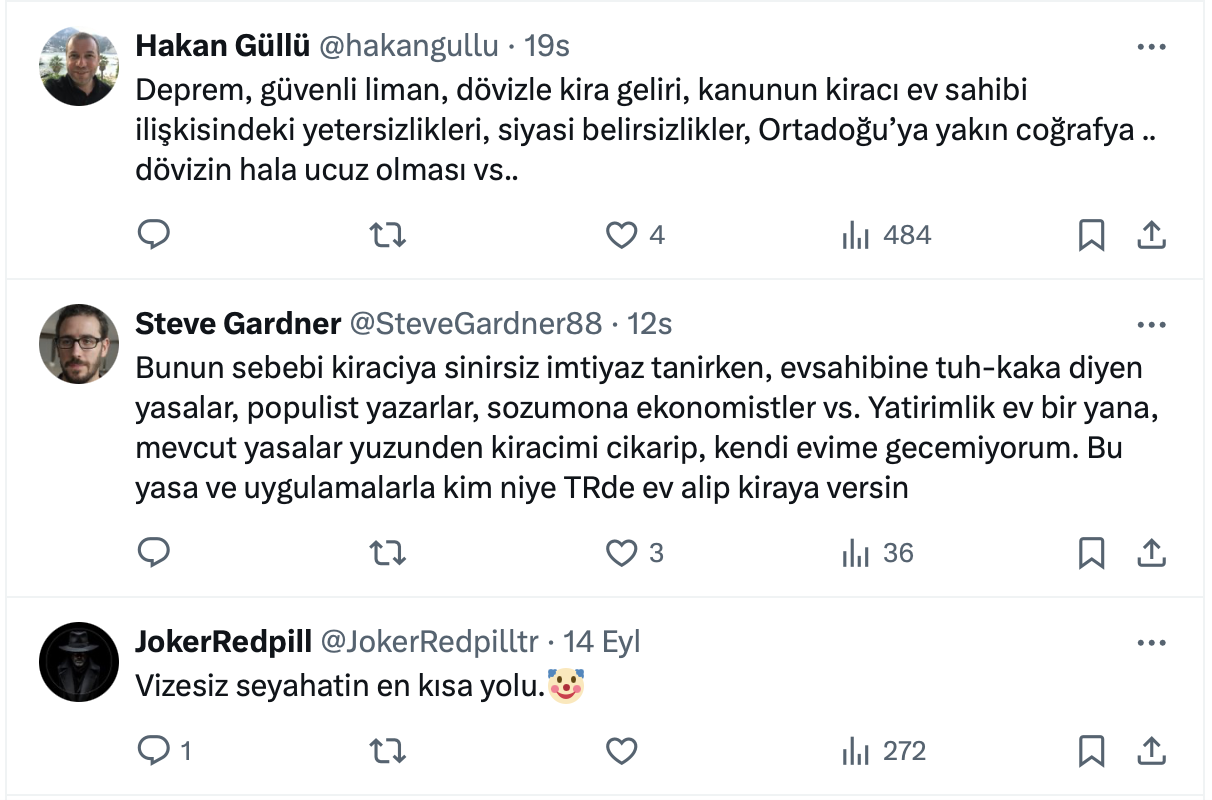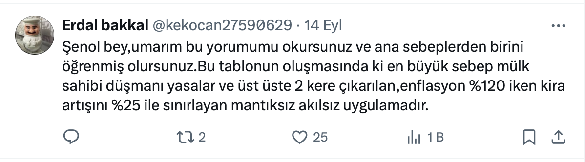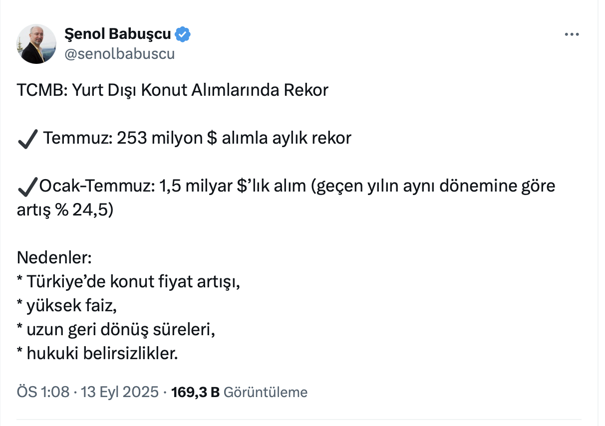 Şenol Babuşcu yaptığı paylaşımda Ocak-Temmuz döneminde 1,5 milyar dolarlık alım yapıldığını belirterek, bunun nedenlerini Türkiye’de konut fiyat artışı, yüksek faiz, uzun geri dönüş süreleri ve hukuki belirsizlikler olarak açıkladı.