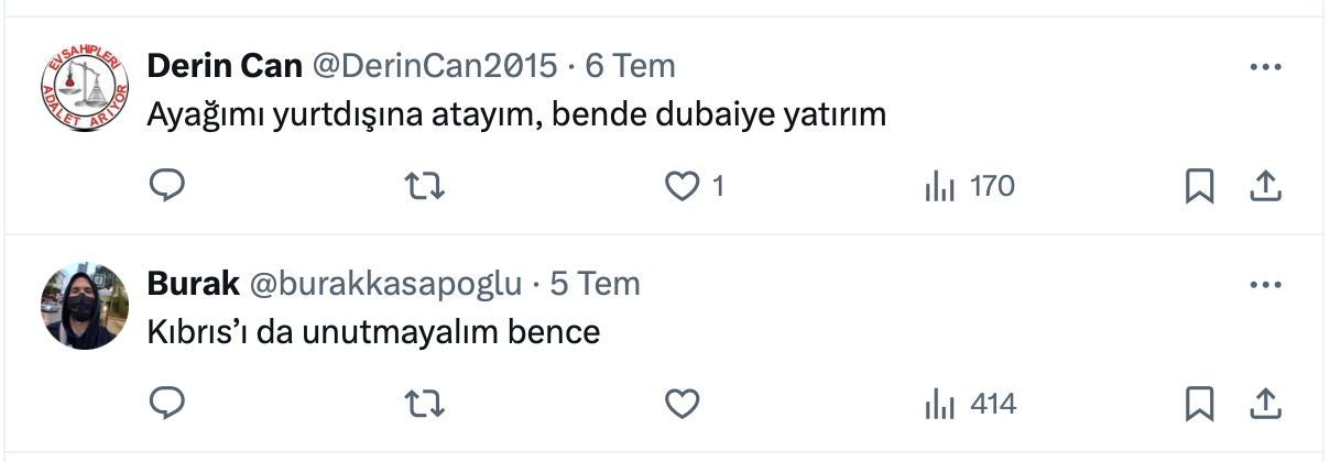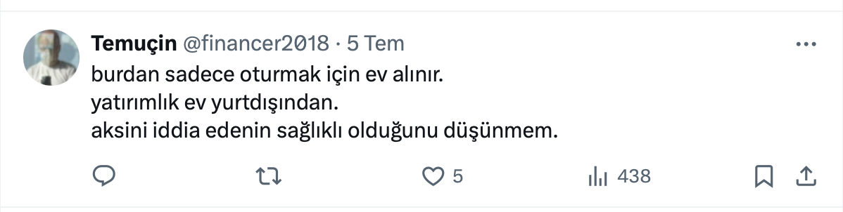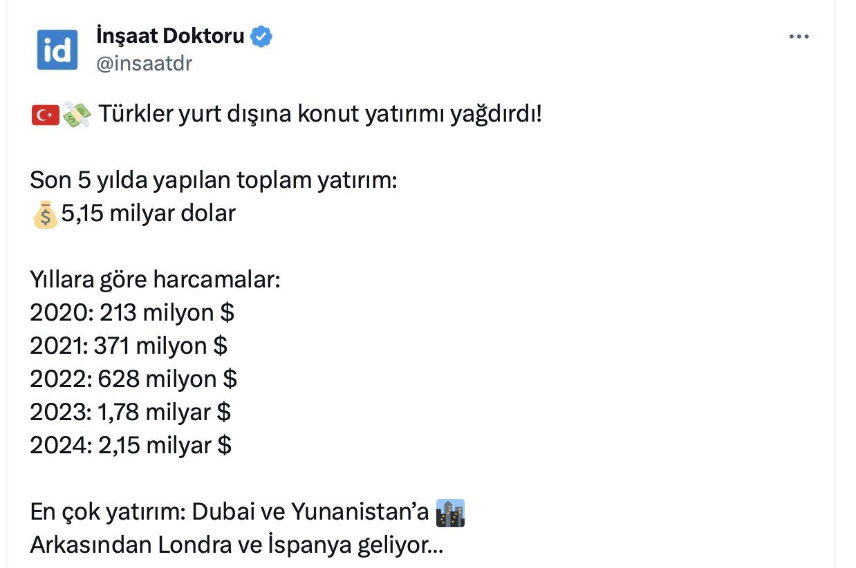 53,3 bin takipçili İnşaat Doktoru yaptığı paylaşımda Türklerin yurt dışına konut yatırımı yağdırdığını belirterek, en çok yatırımın ise Dubai ve Yunanistan’a yapıldığını belirtti.