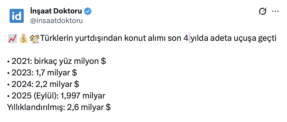 79,5 bin takipçili İnşaat Doktoru resmi sosyal medya hesabı üzerinden yaptığı paylaşımda Türklerin yurtdışından konut alımının son 4 yılda uçuşa geçtiğini belirtti.