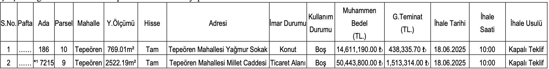 1- Belediyemize ait taşınmazların satış ihalesi 2886 sayılı Devlet İhale Kanunun 36. Maddesine göre Belediyemiz Encümen salonunda 18.06.2025 Çarşamba günü Saat 10:00’da Kapalı Teklif Usulü ile yapılacaktır.