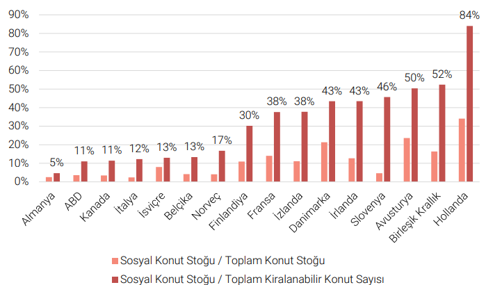 sosyal konutların toplam konut stoğuna oranının en yüksek olduğu ülke, yüzde 34 ile Hollanda.