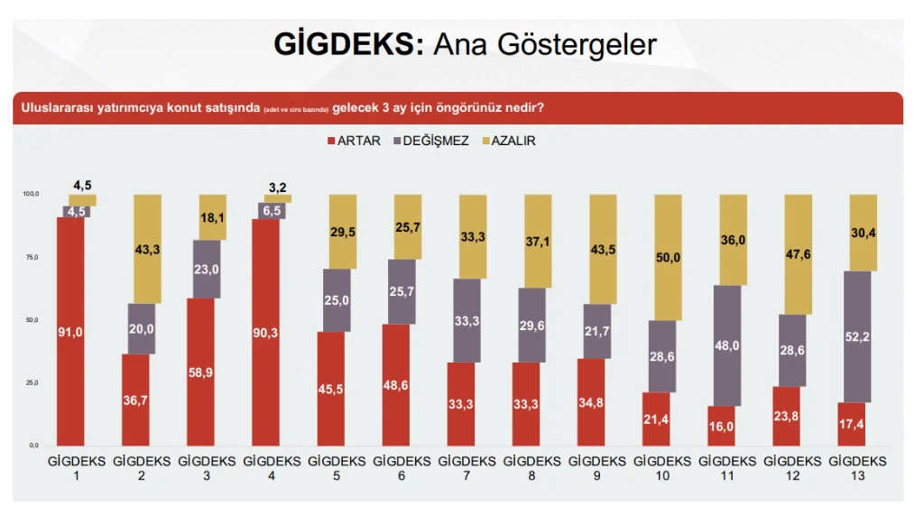 Uluslararası yatırımcıya konut satışında gelecek 3 ay öngörüleri de sorulan GİGDER üyelerinin yalnızca yüzde 17,4’lük kısmı, satışların artacağı şeklinde iyimser görüş verdi. Satışların azalacağını düşünenlerin oranı da bir önceki çeyrekte yüzde 47,6 seviyelerinde iken söz konusu bu çeyrekte yüzde 30,4’e geriledi. Resmi olarak açıklanan verilere göre satışların bir sonraki çeyrekte değişmeyeceğini düşünenler de en yüksek oran ile yüzde 52,2 seviyesinde gerçekleşti.