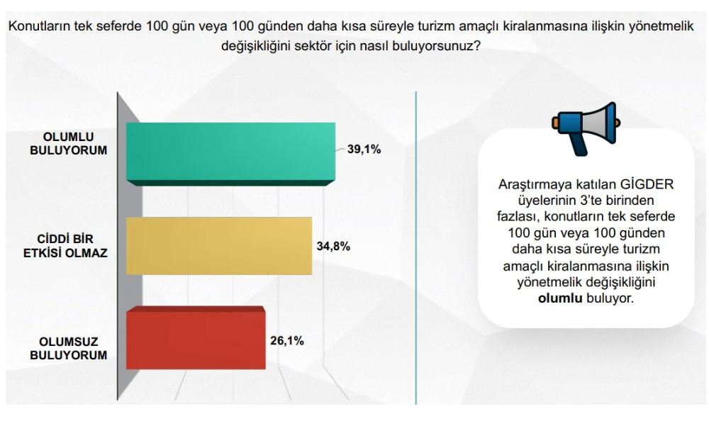 Emsalcom'un aktardığı detaylara göre GİGDEKS 13 çalışmaları kapsamında GİGDER üyelerine, “Konutların tek seferde 100 gün ya da 100 günden daha kısa zamanlı olarak turizm amaçlı kiralanmasına ilişkin yönetmelik değişikliğini sektör için nasıl buluyorsunuz?” sorusu da soruldu. Söz konusu soruya verilen cevaplarda üyelerin yüzde 39,1’lik kısmı bahse konu değişikliği olumlu bulduğunu, yüzde 34,8’lik kısmı ciddi bir etkisi olmayacağını, yüzde 26,1’i de olumsuz bulduğunu belirtti.