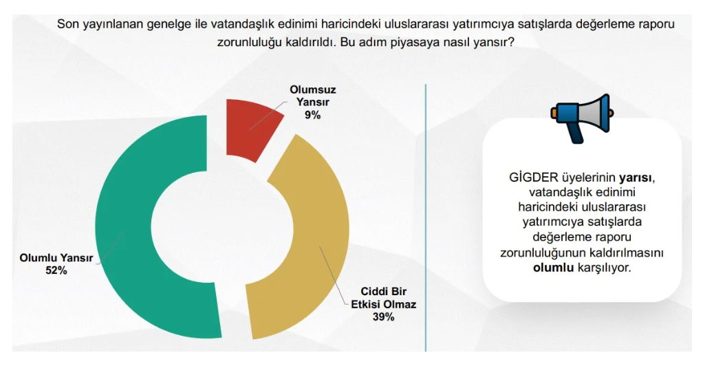 Sektörün merakla beklediği söz konusu çalışmada GİGDER üyeleri, son yayınlanmış olan genelgeyle vatandaşlık edinimi haricindeki uluslararası yatırımcıya satışlarda değerleme raporu zorunluluğunun kaldırılmasıyla ilgili olarak da görüşlerini iletti. Üyelerin yüzde 52’lik kısmı bahse konu değişikliği olumlu karşılarken, piyasaya etkisi olmaz diyenlerin oranı ise yüzde 39’da kaldı.