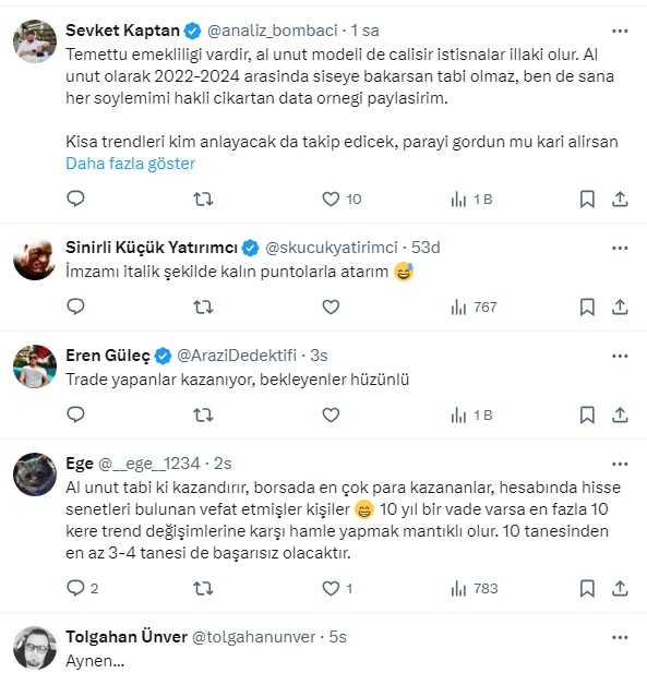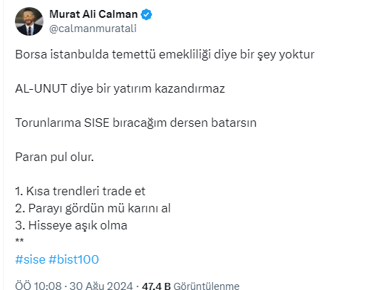 Borsa İstanbul'da dün BIST 100 endeksi, günün ilk yarısında yüzde 0,39 değer kaybederek 9.718,94 puana geriledi. Borsada düşük seyir devam ederken yatırımcılar tarafında tedirgin bekleyiş sürüyor. Yatırımcılar kazançlı çıkmanın yollarını ararken, Murat Ali Calman'dan uyarı geldi. Calman, Borsa istanbulda temettü emekliliği diye bir şeyin olmadığını söyleyerek 'AL-UNUT diye bir yatırım kazandırmaz' dedi.