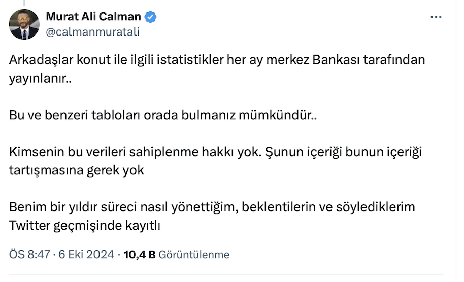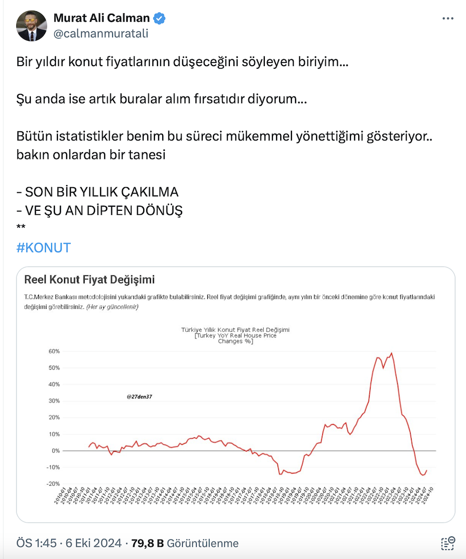 Yatırımcıların gündeminden düşmeyen konu ile ilgili olarak resmi sosyal medya hesabı https://x.com/calmanmuratali üzerinden bir açıklama yapan Analist ve kripto fenomeni Murat Ali Calman, “Bir yıldır konut fiyatlarının düşeceğini söyleyen biriyim. Şu anda ise artık buralar alım fırsatıdır diyorum.” ifadelerini kullandı.