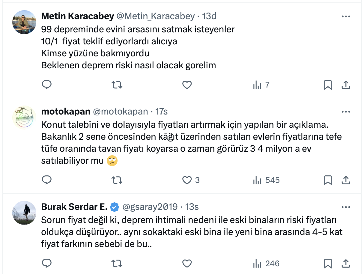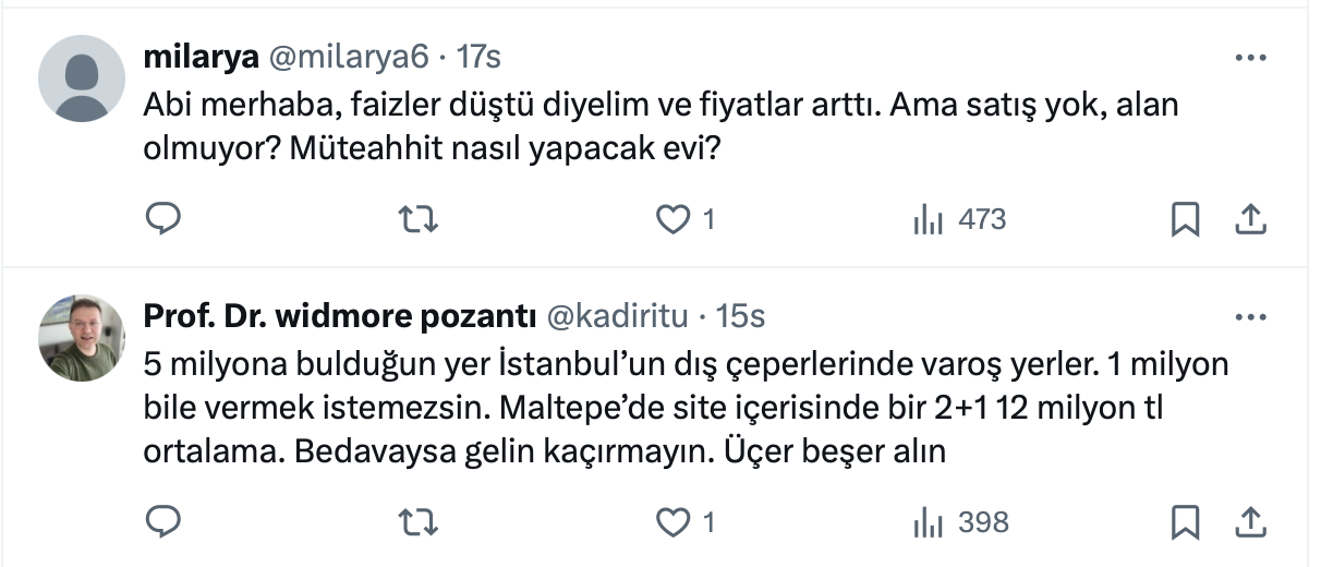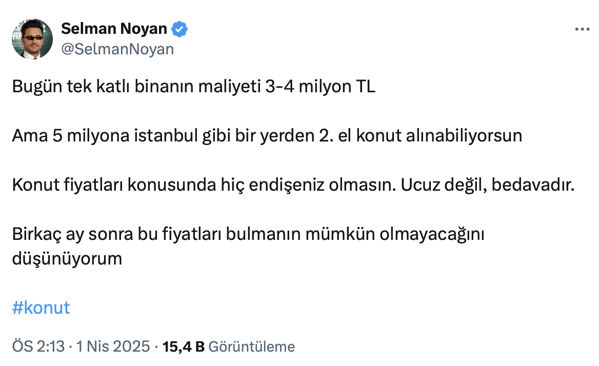 Selman Noyan paylaşımında bugün tek katlı binanın maliyetinin 3-4 milyon TL olduğunu belirterek, “Ama 5 milyona istanbul gibi bir yerden 2. el konut alınabiliyorsun. Konut fiyatları konusunda hiç endişeniz olmasın. Ucuz değil, bedavadır. Birkaç ay sonra bu fiyatları bulmanın mümkün olmayacağını düşünüyorum” ifadelerini kullandı.